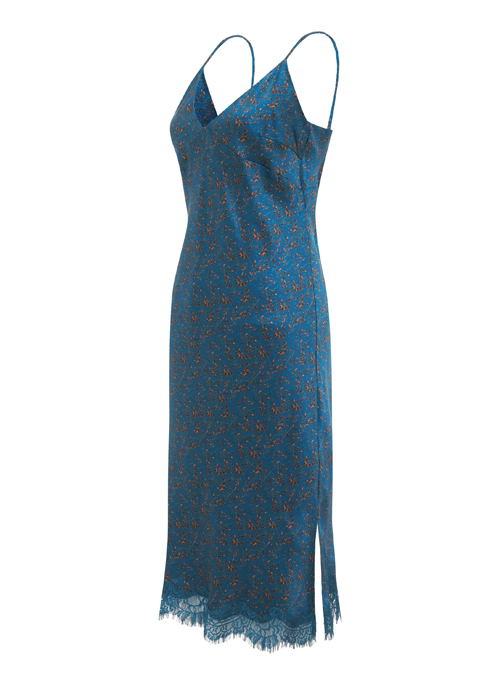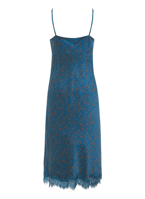 Silk slip dress cut on the bias finished with lace at the hem. This dress is mid-length / knee length, has adjustable straps, and has a slit on the side seam. Layer it, or use it on its own.