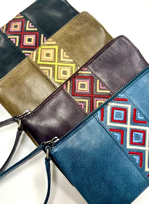 Sometimes less is more! This compact wallet/wristlet with embroidered ribbon detail, holds your phone, cards + cash.