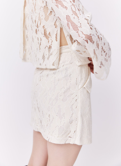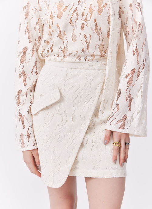 The intricate abstract Elise Lace Skirt adds a touch of femininity to this asymmetric mini skirt silhouette. Expertly cut in layers and fully lined, featuring a functional single flap pocket, our Elise Lace Skirt is made from premium Japanese organic cotton blend. It is hand-washable for an easy-care wardrobe.