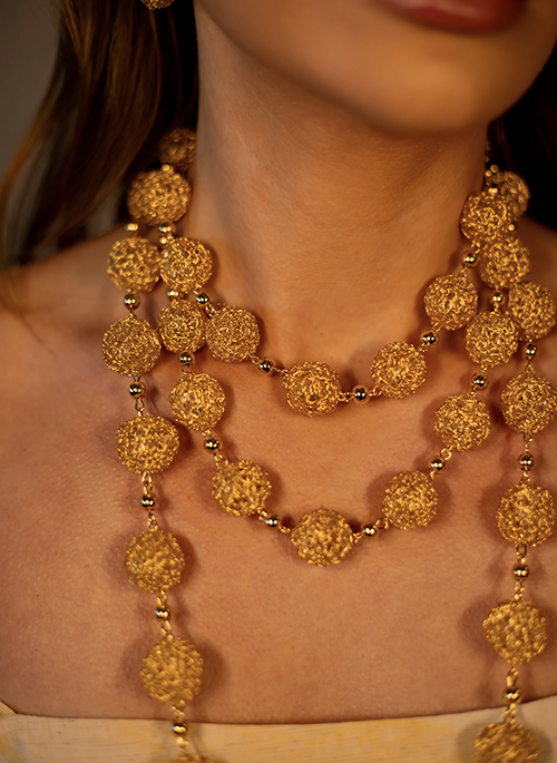 This beautiful, long hand-crocheted necklace was created by highly skilled Brazilian artisans. They are made with 18 karat gold filled wire. It makes a statement without the weight or bulk. Made with hypoallergenic and nickel-free materials. Stunning jewelry that will last for a lifetime. Each piece of jewelry takes hours to finish. The result is a remarkable piece of jewelry.Details:
