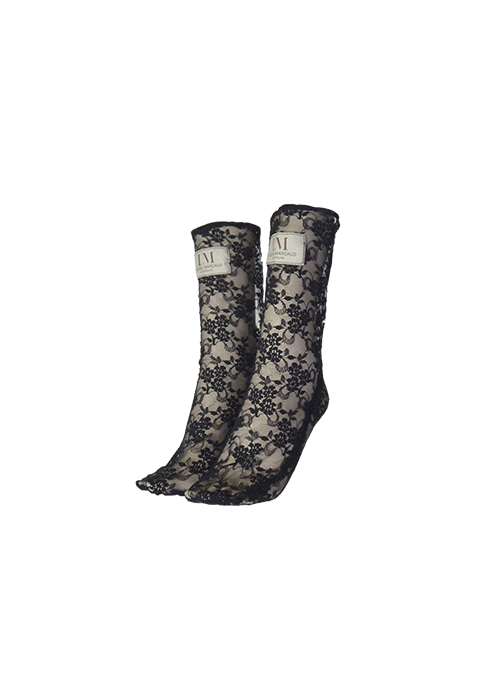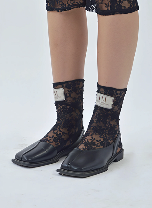 Details: Black lace knee-high socksLouise Marcaud woven label on the frontCutouts following the lines of the foot Slightly loose to create a pleated effect