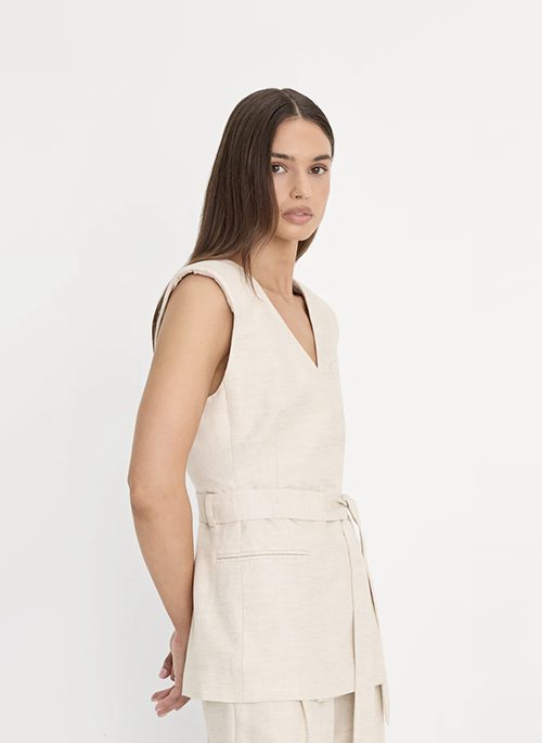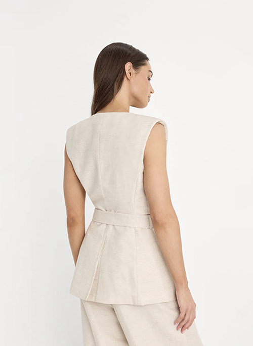 The linen vest of your dreams. A form-hugging fit with a flattering deep V-neckline, structured shoulder pads and a detachable belt. Made with a lightweight, breezy linen-blend fabric.Details: