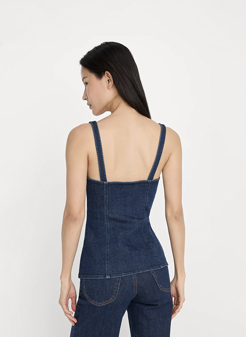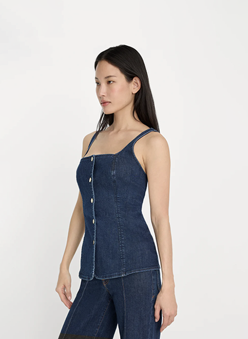 The button-front denim top. A structured, sleeveless tank with buttons down the front and a clean, wearable silhouette. Made from our premium power stretch denim, this top will hold its shape with extra stretch and easy, all-day comfort.Details: