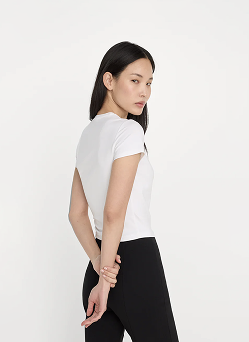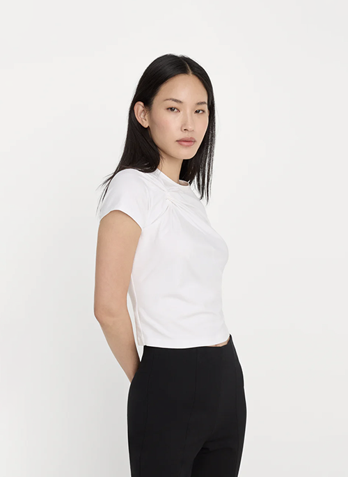 The classic baby tee, with a twist. A slim, form-fitting design embraces your shape, with a twist at the top that adds a unique look. Crafted from premium cotton with unparalleled stretch, it molds to your curves and gently holds you in.Details: