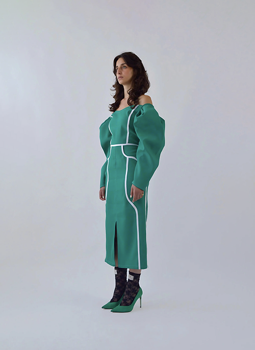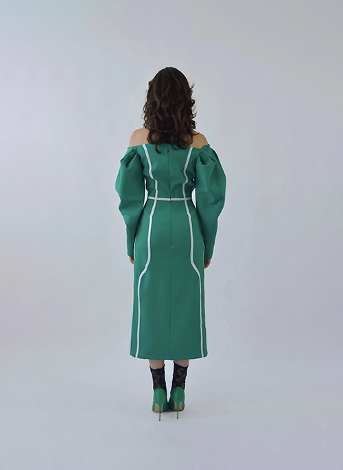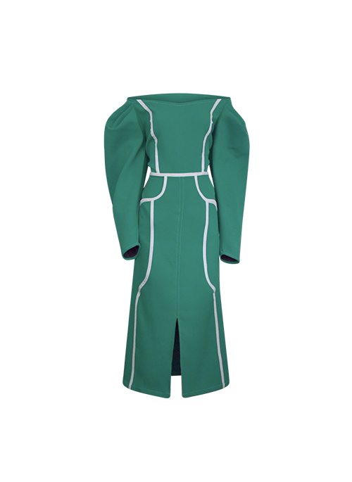 Details: Midi dress with wide, dropped shouldersblack satin or emerald green woolFinishes highlighted by a contrasting white bias bindingDiscreet slit and patch pocketsAdjustable shoulders thanks to internal elastic bands